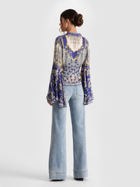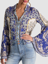 Our signature Willa, with a twist. This version features a clean hidden placket, collared neckline, and wide bell sleeves for a more sculptural take on the classic button-down. Cut in our forevermore floral print, it feels like a wardrobe staple dressed up for the season. DETAILS - Button down - Printed double viscose - Hidden placket - Bell sleeves - Collared - Digitally engineered print - 100% viscose - Dry clean only - Imported FIT - Model is 5'10" and wearing a size XS - Length from the shoulder: 24" - Fits true to size, take your normal size