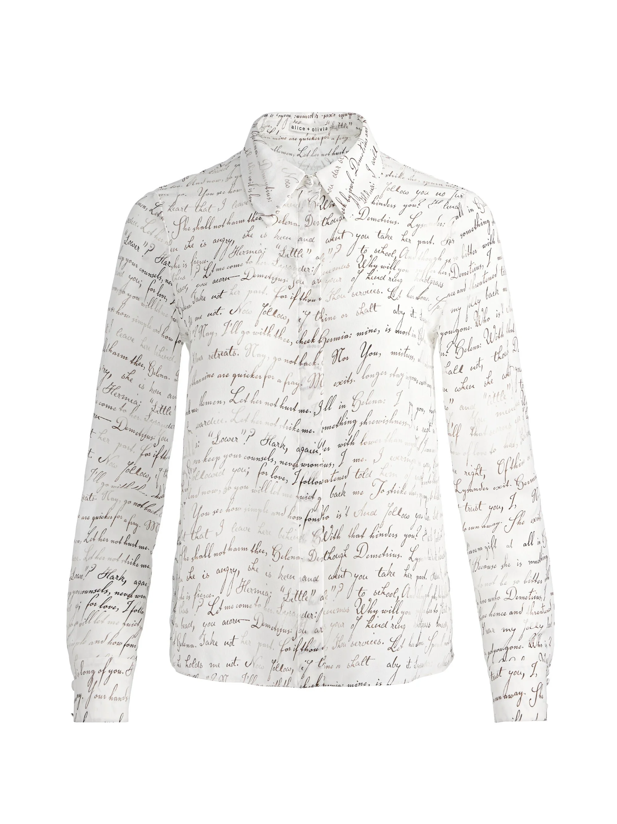 Part of our exclusive collaboration with the Royal Shakespeare Company, our newest Willa silk blouse is equal parts romantic and dreamy. With a crisp collar, hidden placket, and lightweight feel, it’s polished enough for dinners out and sophisticated enough to dress up for work. Wear this shirt tucked into denim or a skirt- it's the kind of top that can do it all. DETAILS - Button down - Printed silk crepe de chine - Long sleeve - Hidden placket - Front button closures - 100% silk - Dry clean only - Imported FIT - Model is 5'10" and wearing a size XS - Length from the shoulder: 23 1/4" - Fits true to size, take your normal size