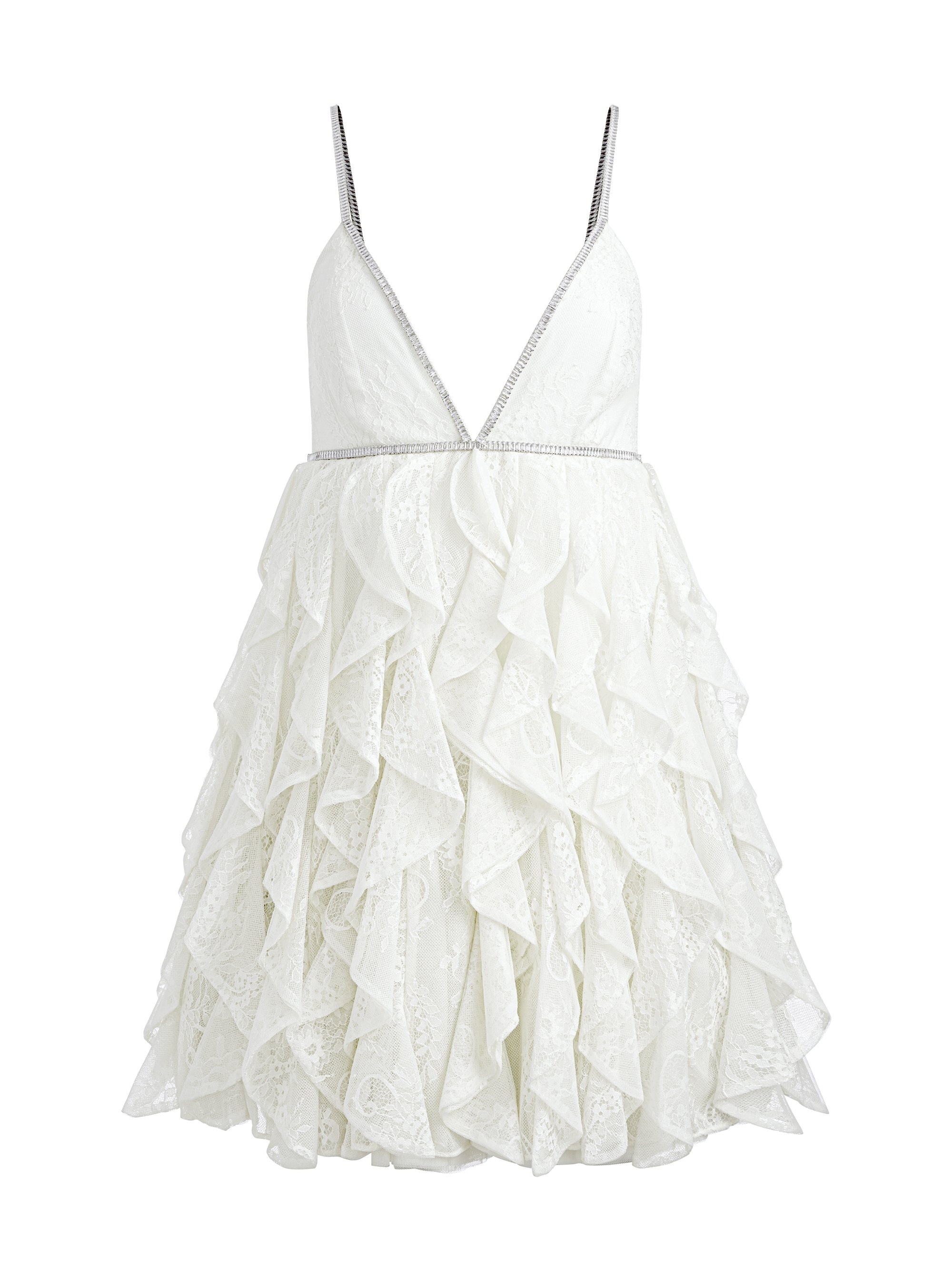 A dreamy mini gown, if you prefer your hemlines on the shorter side. This one includes smocking in the back for an adjustable fit, tiers of ruffles at the skirt and a back zip closure. We love the deep V-neckline for an elegant finishing touch. DETAILS - Mini gown - Low V-neck - Lace - Embellished bodice - Smocked back - Back zipper closure - Ruffled skirt - 100% nylon - Dry clean only - Imported FIT - Total length: 33 1/2” - Fits true to size, take your normal size - Model is wearing a size 2 and her measurements are 5’10”, 32” bust, 23” waist, 34” hips