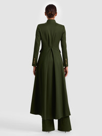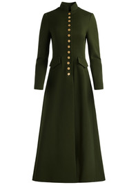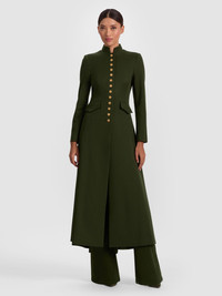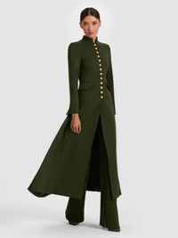 The Winn jacket brings authority and allure in equal measure. Designed in a dark olive twill sateen with a charmeuse-lined interior, it delivers structure without stiffness. Gold buttons and a mock neck lend a military-inspired look, while the maxi length adds sweep and drama. It’s the ultimate statement outerwear--commanding yet wearable, made to elevate everything from denim to dresses. Think of it as your cold-weather power move: bold, sophisticated, and completely unforgettable. DETAILS - Maxi jacket - Chintz twill sateen - Lined charmeuse interior - Mock neck - Front pockets - Gold button front closures - 64% polyester, 32% viscose, 4% elastane - Dry clean only - Imported FIT - Model is 5'10" and wearing a size 0 - Length from the shoulder: 54" - Fits true to size, take your normal size