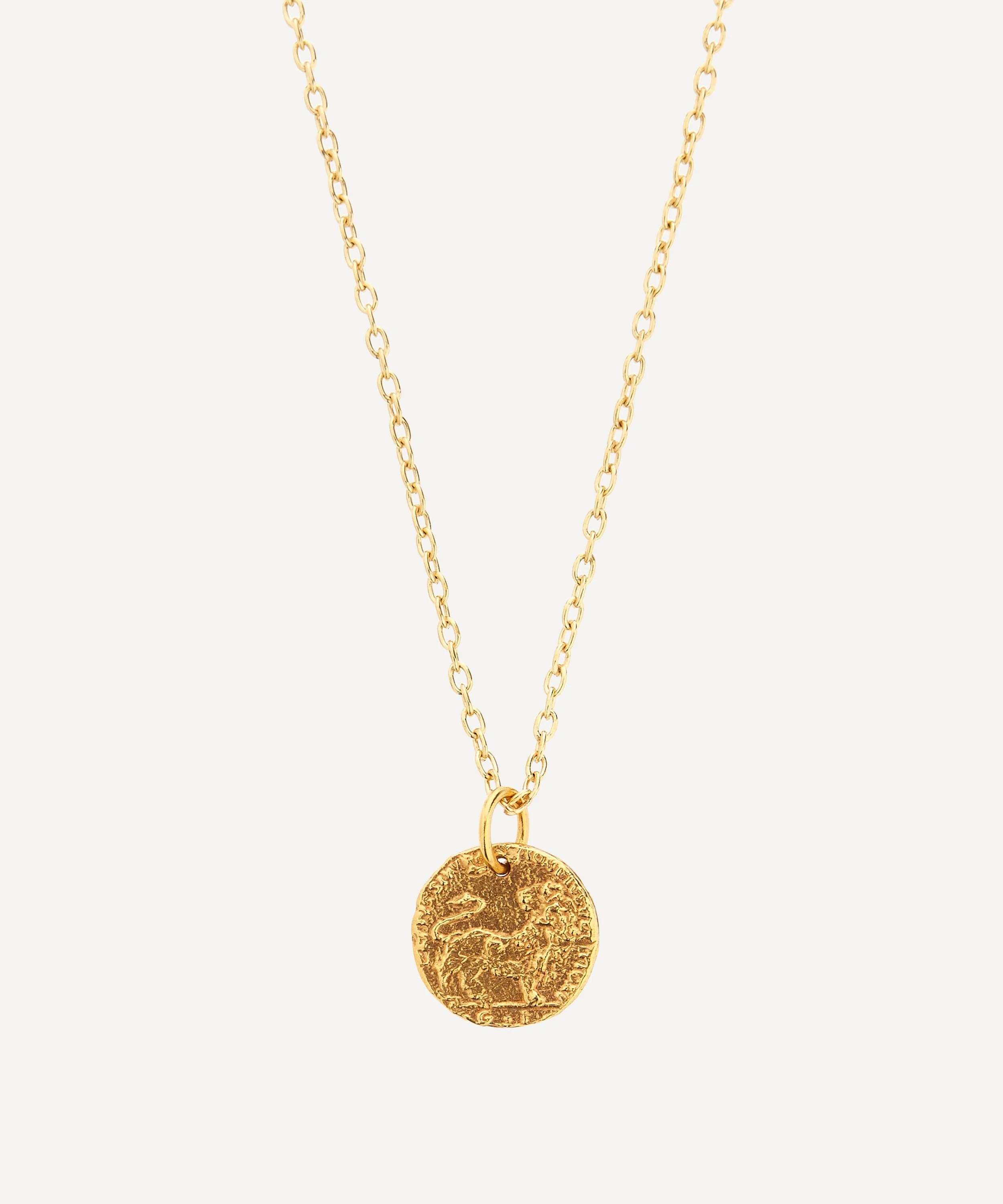 DETAILS Pendant necklace 24ct gold-plated bronze Coin pendant Baby lion motif Link chain Spring clasp fastening Made in England COMPOSITION & SIZE 24ct Gold-Plated Bronze Pendant L: 1.3, W: 1cm Chain L: 40cm/45cm/51cm