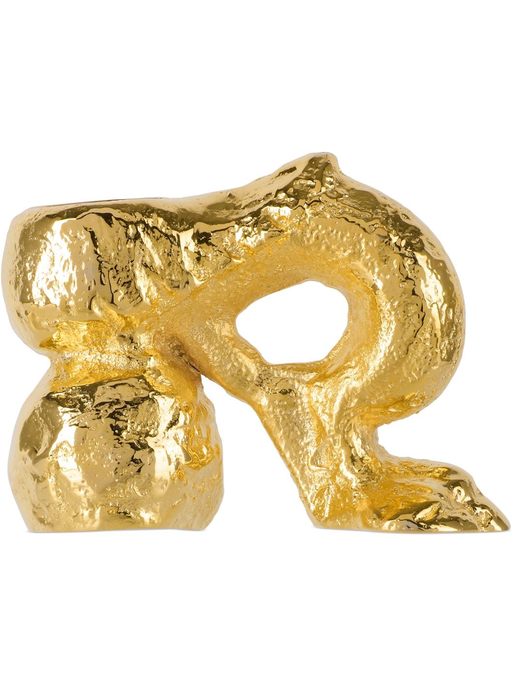 Sand-casted sculptural candle holder in 24k gold-plated brass. - Handcrafted - Textured detailing throughout - Logo engraved at base - Fits 2 cm tapered candle - H6 x W8 x D3 cm Supplier color: Gold-plated brass