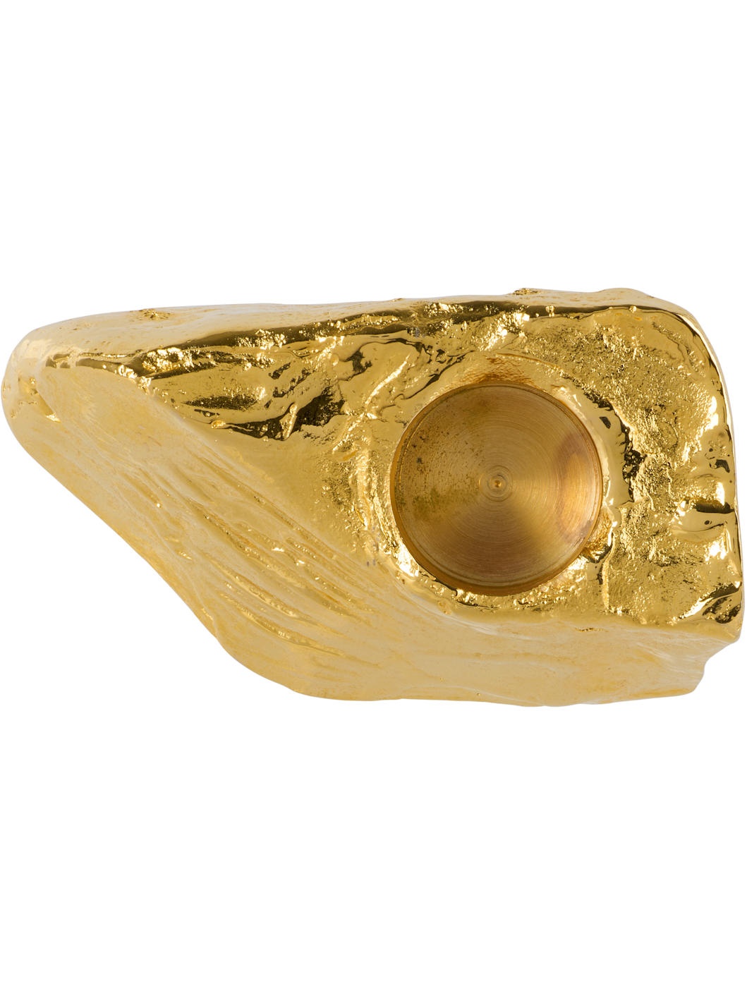 Sand-casted candle holder in 24k gold-plated brass. - Handcrafted - Textured detailing throughout - Logo engraved at base - Fits 2 cm tapered candle - H2.8 x W8 x D3.5 cm Supplier color: Gold-plated brass