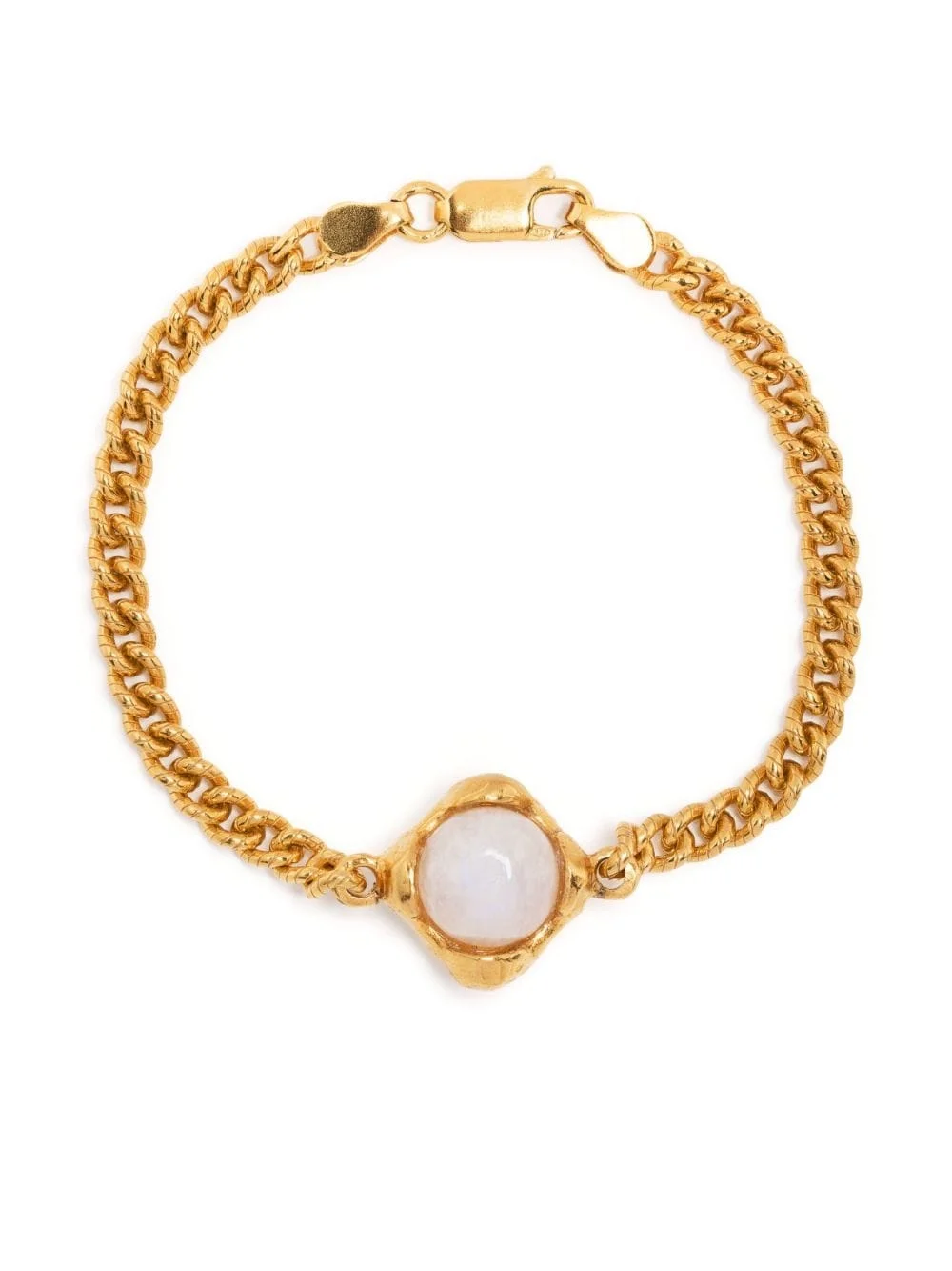 The Eye of the Moonstone bracelet Handcrafted in the United Kingdom from 24kt gold-plated bronze, Alighieri's The Eye Of The Moonstone bracelet is strung with a polished moonstone-encrusted pendant that takes the central focus. It features a lobster claw fastening, making its length adjustable. Highlights - 24kt gold plated - Moonstone - Delicate chain - Lobster claw fastening Made in United Kingdom SIZE & FIT Model measurements Height 5 ft 9 in(1.76 m) Bust/Chest 31.1 in(79 cm) Hips 35.03 in(89 cm) Waist 24.4 in(62 cm)