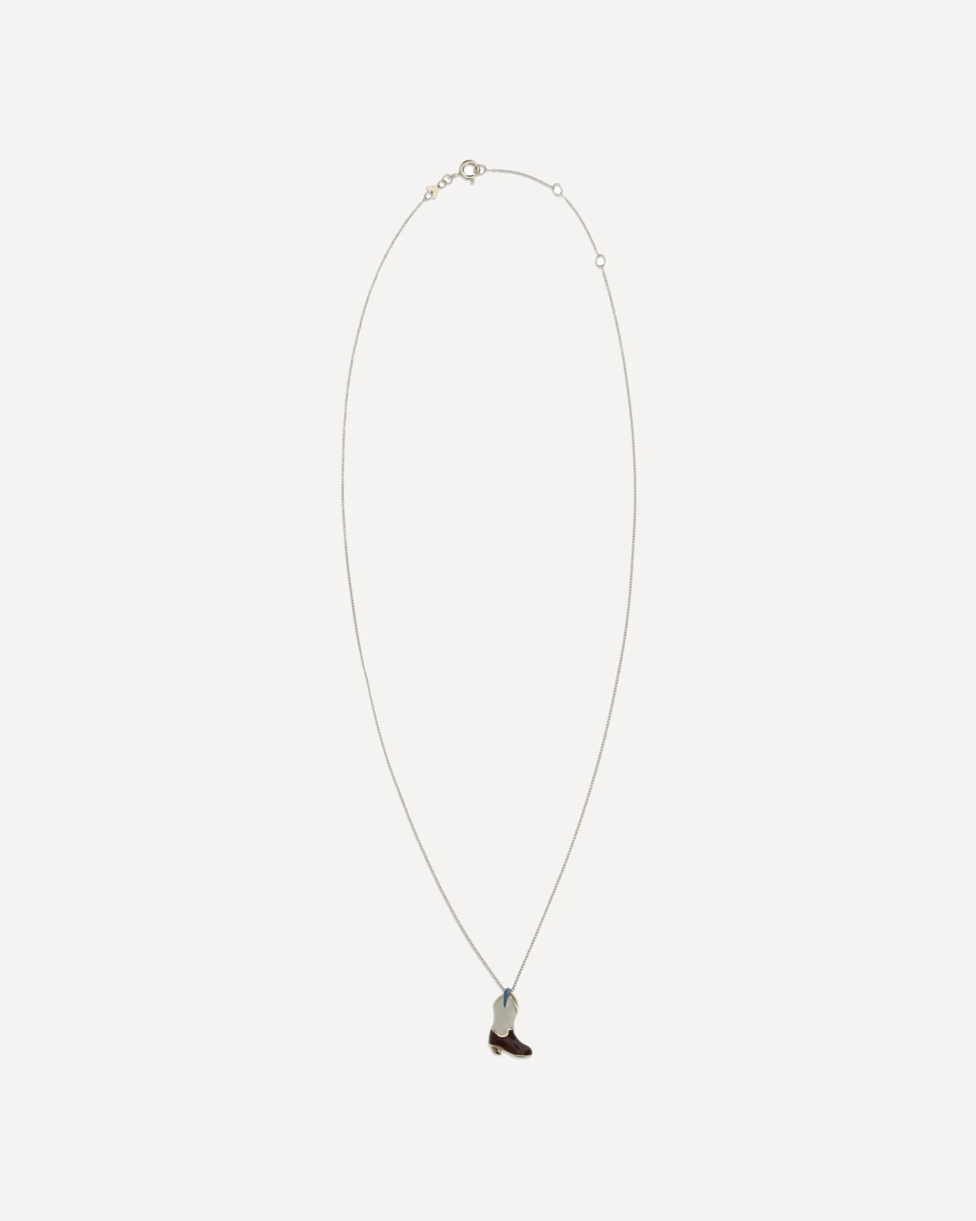 Cowboy Boot Necklace by Alita is a piece of jewelry with a playful and original character, perfect for those who want to add a touch of personality to their collection. Made of 9-karat yellow gold and hand-enameled, it features a rolo chain with a ring clasp, on which a pendant in the shape of a western boot stands out, small but rich in detail. An accessory that is both ironic and refined, designed for those who like to stand out lightly. DETAILS - Sku: NRSPFL1000YG09K_Z1D00 - Season: SS26 - Composition: GENERAL 100% Others Materials - MADE IN ITALY