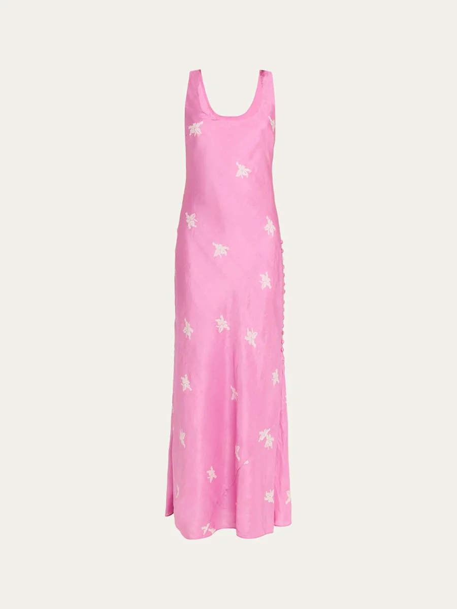 Crafted from luxurious, handloomed silk, the "Adele" dress by Alix of Bohemia is adorned with a Jasmine print and boasts delicate covered buttons along the sides. Scoop neckline Sleeveless Slim, slip silhouette Side slit hem Invisible side zip Silk Lining: Cotton/silk Dry clean only Imported