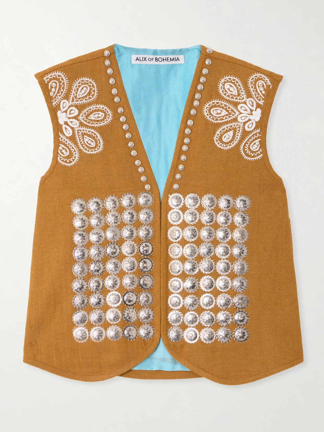 Inspired by Alix Verley-Pietrafesa's personal collection of vintage textiles, Alix of Bohemia's collections evoke the carefree spirit of the '70s. This 'Arizona' vest is made from silk that's been beautifully hand-embroidered in India with floral motifs and is embellished with silver studs. Wear yours with floaty blouses and dresses. Responsible Craftsmanship. This product promotes artisanal skills and a brand that invests in communities and adheres to fair-trade principles. Find out more about our NET SUSTAIN criteria here.