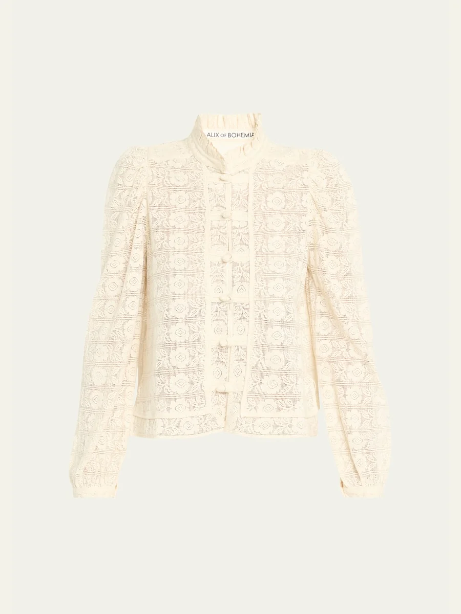 Alix of Bohemia "Artemis" delicate cottonlace blouse adorned with a ruffled collar Long puff sleeves with button cuffs Classic fit Hem falls to the hip Knotted buttonfront Cotton Dry clean Imported