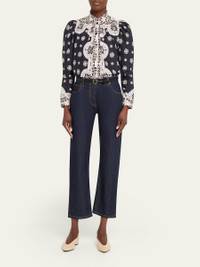 Crafted in airy cotton voile, the "Artemis" blouse by Alix of Bohemia features an intricate allover print. Ruffled stand collar Long puff sleeves Classic fit Hem falls to the hip Buttonfront Cotton/silk Unlined Dry clean Imported