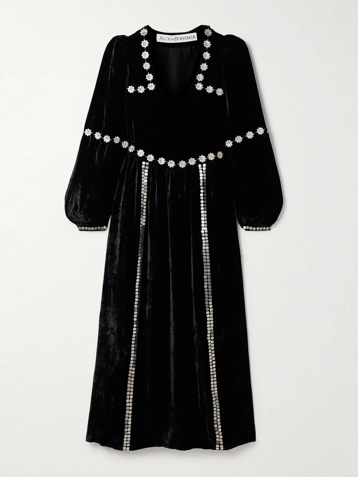 Alix of Bohemia often looks to decades past for inspiration, and it's easy to see the Renaissance influences in this ‘Imogen' dress. Made from plush velvet, it's embellished with silver-tone flowers and discs along the V-neckline, puffed sleeves and fluid midi skirt. We know you'll appreciate the discreet slip pockets.