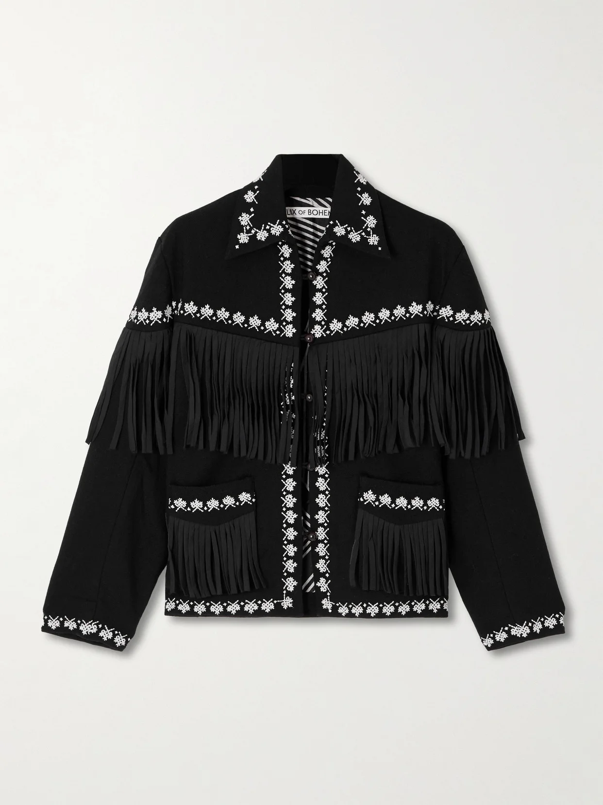 Alix of Bohemia's 'Jude' jacket is traced with fringe and intricate embroidery along the edges. It's made from wool-flannel and has a full lining for structure. Lean into its Western feel and wear it with cowboy boots. Responsible Craftsmanship. This product promotes artisanal skills and a brand that invests in communities and adheres to fair-trade principles. Find out more about our NET SUSTAIN criteria here.