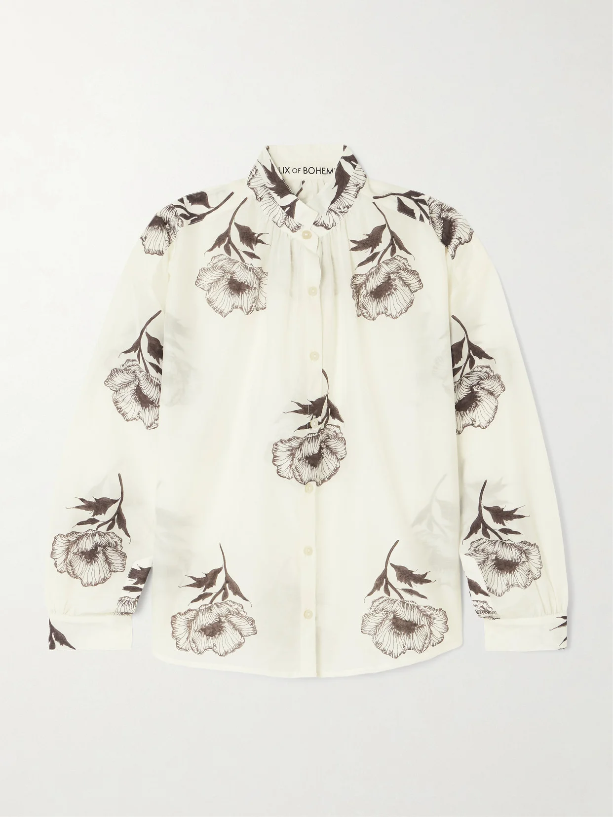 Often influenced by moments of fashion history, Alix of Bohemia's 'Kiki Obsidian' shirt is inspired by Edwardian design. It's cut from cotton and silk-blend with a stand collar and gentle gathering throughout. The hand-block print features long-stem poppies, adding an artful finishing touch.