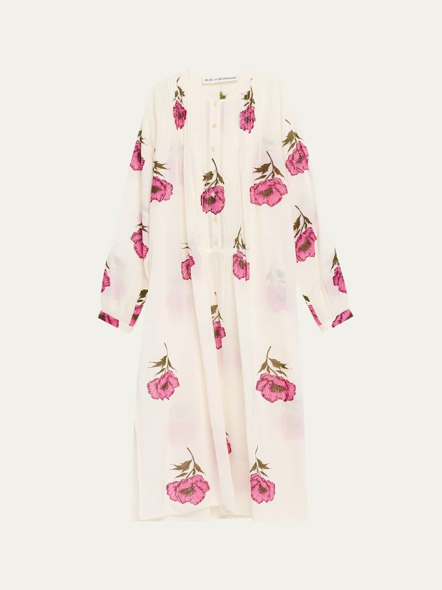 Alix of Bohemia "Nyxe" breathable cotton dress adorned with a vibrant poppy print Crew neckline; butonplacket Long sleeves with button cuffs Loose silhouette Hem falls below the knee Slipover style Cotton Dry clean Imported