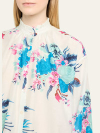 Alix of Bohemia "Poet" cotton blouse featuring a Berry Jackfruit motif Stand collar; buttonfront Long sleeves with button cuffs Loose fit Hem falls to the hip Cotton Unlined Machine wash cold Imported