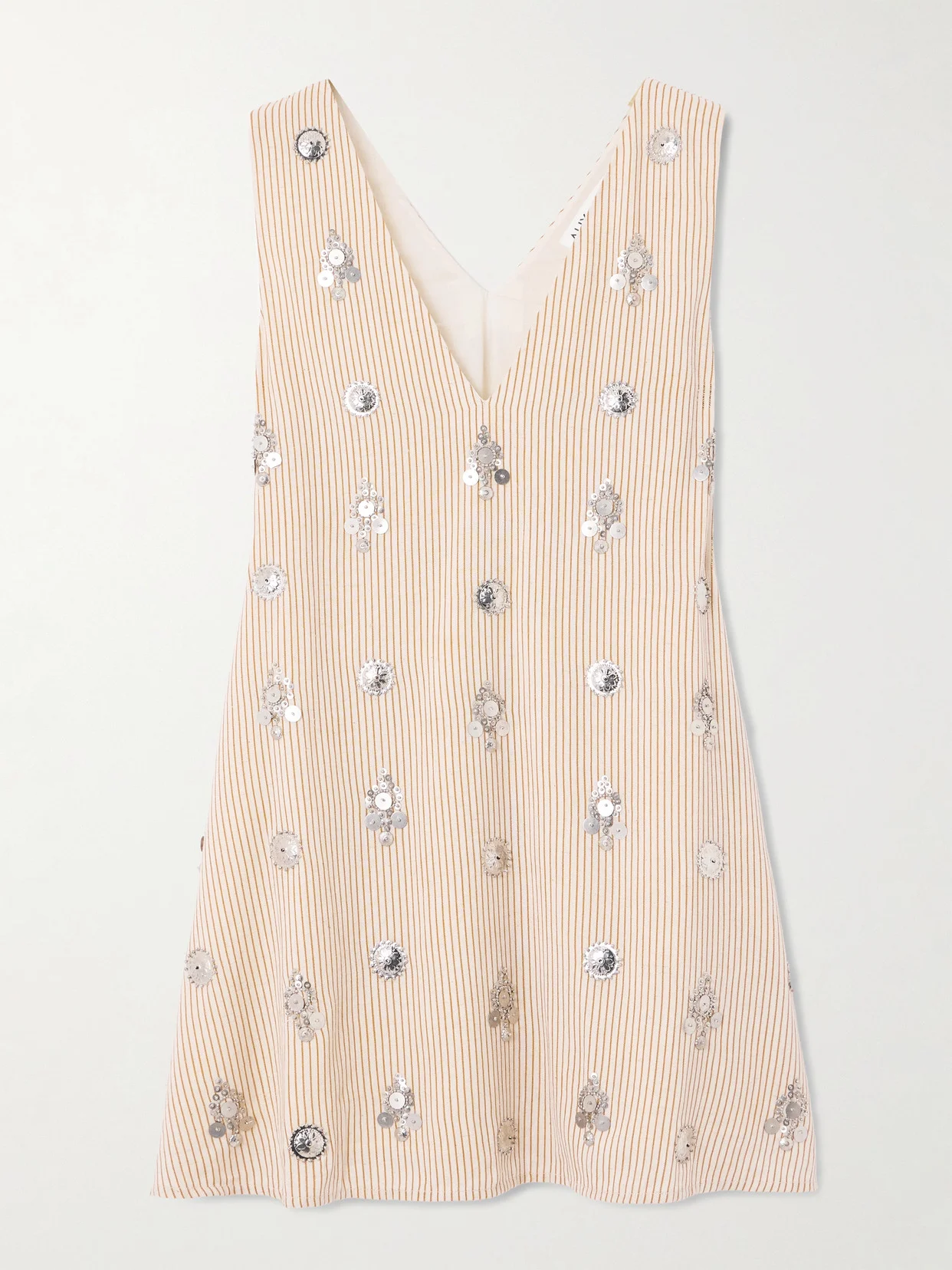 A genuine love of vintage textiles inspires Alix of Bohemia's designs. This 'Soleil Cedar' mini dress is cut from airy striped linen with a deep V-neckline and back and finished with hand-applied metallic embellishments, so no two are the same. Responsible Craftsmanship. This product promotes artisanal skills and a brand that invests in communities and adheres to fair-trade principles. Find out more about our NET SUSTAIN criteria here.