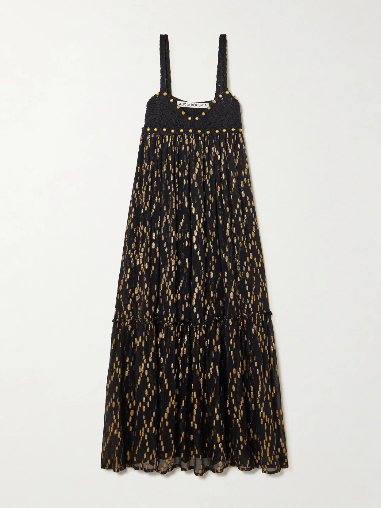 Alix of Bohemia's 'Victoria Twilight Mist' dress captures a dreamlike balance between ease and drama. Designed with crocheted cups traced with beads, it's cut from fil coupe-voile that cascades into a wispy tiered silhouette. Pair yours with barely-there sandals and delicate jewelry.