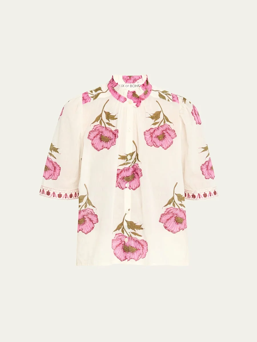 Alix of Bohemia "Winn" breathable cotton blouse adorned with a vibrant poppy print Stand collar Short sleeves Classic fit Hem falls to the hip Buttonfront Cotton Dry clean Imported
