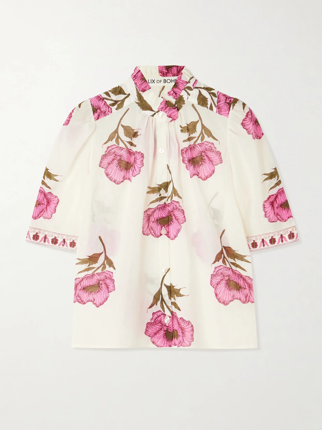 Alix of Bohemia's collections are imbued with a carefree, bohemian spirit. This 'Winn' shirt is cut from airy cotton-voile that's decorated with painterly florals and trimmed with romantic ruffles at the collar.