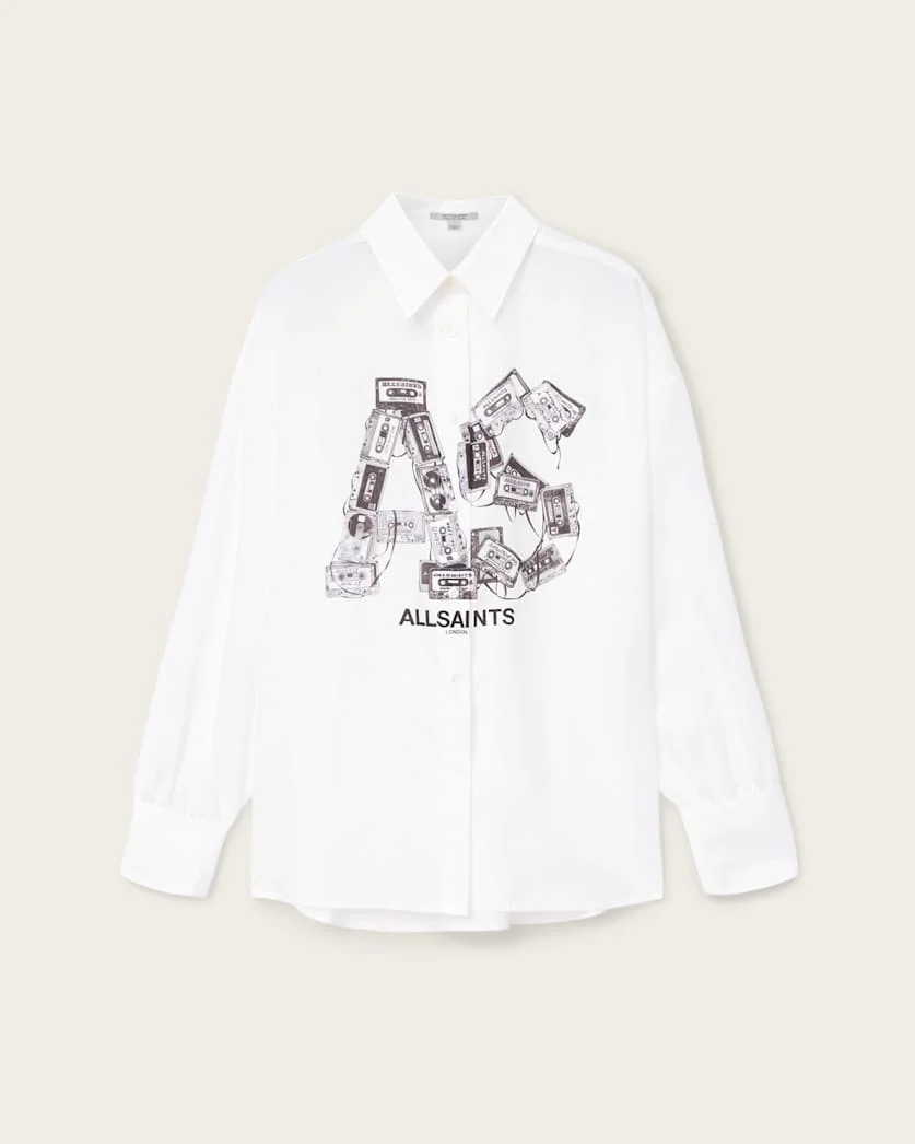 Adrienne Print Shirt Music has always been at the heart of AllSaints and our Adrienne Shirt is a visual reflection of that. Whether you’re looking for your next gig outfit or a standout piece for everyday, look no further than this shirt. - Button closure - Long Sleeves - Collar - Cassette graphic with AllSaints branding - Model is 5'9" and wearing size US 4 FABRIC & CARE: - 95% recycled polyester, 5% cotton - Mild machine wash Made in: China Product ID: USW109PE-10