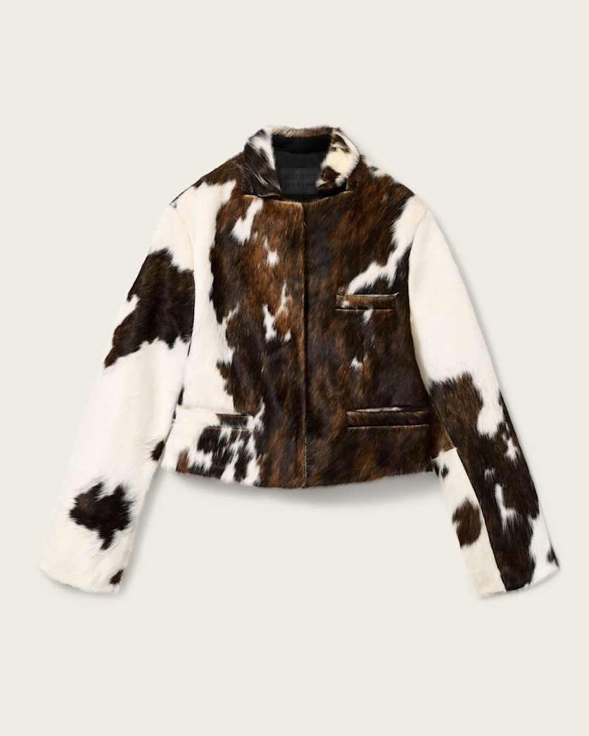Apton Dapple Cowhide Blazer Style out your western dream in our Apton Cowhide Blazer, a design that doesn't play by the rules. Wear with our classic indigo jeans to complete the cowgirl look or match with formal trousers to stand out at your next occasion. - Concealed centre fold magnet fastening - Collar - Long sleeves - Cropped length - Measurements (from CB to hem): 46.5cm - Model is 5'10" and wearing size US 4 FABRIC & CARE: - Shell: 100% natural hair on cowhide - Lining: 100% recycled polyester - Professional leather clean only - Our products crafted from cowhide (hair-on-hide) are unique and variations in hair length, texture, color, and pattern are to be expected and are inherent characteristics of the product. These variations are not defects but rather enhance the individuality and natural beauty of each item. Over time, shedding or wear of the hair may occur. Made in: India Product ID: USW094LC-10367