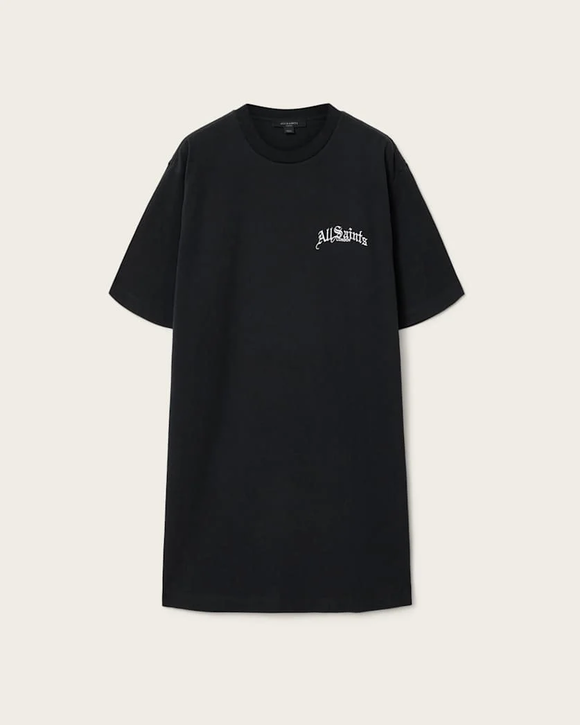 Descent Jersey Mini T-Shirt Dress The Descent T-Shirt Dress brings relaxed jersey comfort to a mini dress silhouette. With short sleeves, a crew neckline and ribbed trims (with AllSaints embroidery at the chest and back), it transitions effortlessly through seasons and plans. Explore more of our dresses. - Ribbed crew neckline for a casual, comfortable style - Short sleeves perfect for warm weather styling - AllSaints embroidered logo at the chest with a screenprinted back design - Measurements (from SNP to hem): 88cm - Model is 5'10" and is wearing size Small FABRIC & CARE: - 100% organic cotton - Mild machine wash Made in: Turkey Product ID: USW270DE-162