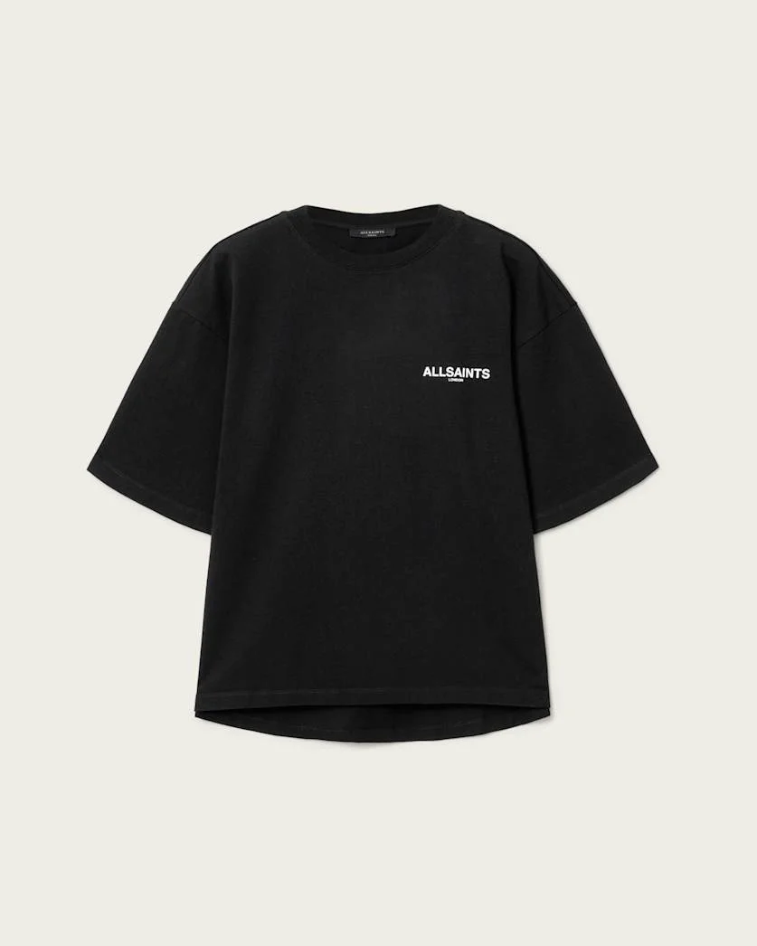 Halis Oversized Amelie T-Shirt The Halis Amelie T-Shirt features a large hallis print artwork at the back of the garment. Cut to an oversized fit for comfortable wear and finished with ribbed trims. Discover the rest of our women's t-shirt and jersey collection. - High/low hemline - Ribbed neckline trims with twin needle at the hem and cuff for distinctive styling - Front artwork: AllSaints London - Back artwork: Large Halis print on centre back - Model is 5'9.5" and wearing size Small FABRIC & CARE: - 100% organic cotton - Mild machine wash Made in: Portugal Product ID: USW140JE-5