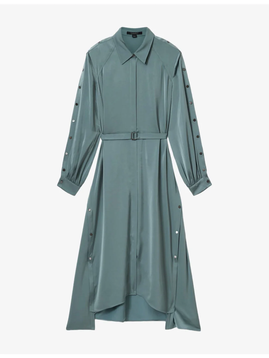 PRODUCT DETAILS - AllSaints woven dress - 55% recycled polyester, 45% polyester - Concealed button fastenings at front - Relaxed fit, classic collar, long sleeves, belted at the waist, asymmetric hem - Machine wash at 30°C - True to size - Model is 5ft 11in / 1.80m and wears a size UK 10 - Lightweight, non-stretch Ref: R04369139
