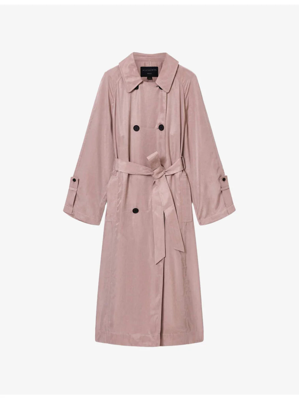 PRODUCT DETAILS - AllSaints woven trench coat - 100% lyocell - Exposed button fastening at front - Relaxed fit, collared, long sleeves, double-breasted, tie belt at the waist, two pockets at the side - Dry clean - True to size - Midweight, non-stretch Ref: R04524580