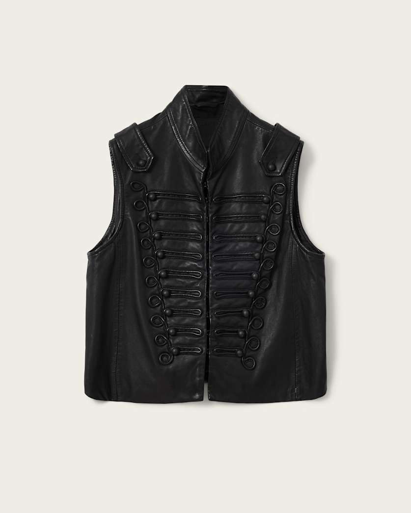 Rummy Leather Gilet We're going back to our roots – this classic military style is crafted from our finest luxury leather. The Rummy is a sleeveless option that looks great paired with one of our statement slip dresses or wide-leg jeans. - Button closure with domed buttons - Sleeveless - Stand collar - Self-leather brocade detailing - Hook & eye fastenings - Measurements (from CB to hem): 49cm - Model is 5'9" and is wearing US 4 FABRIC & CARE: - Shell: 100% sheep leather - Lining: 100% recycled polyester - Professional leather clean only Made in: India Product ID: USW016LE-5