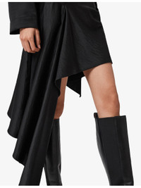 PRODUCT DETAILS - AllSaints woven mini skirt - 100% polyester - Concealed zip fastening at side - Regular fit, high waist, asymmetric draping, long draped panel at one side, pleated side seam, asymmetric length - Machine wash cold - True to size - Lightweight, non-stretch Ref: R04510404