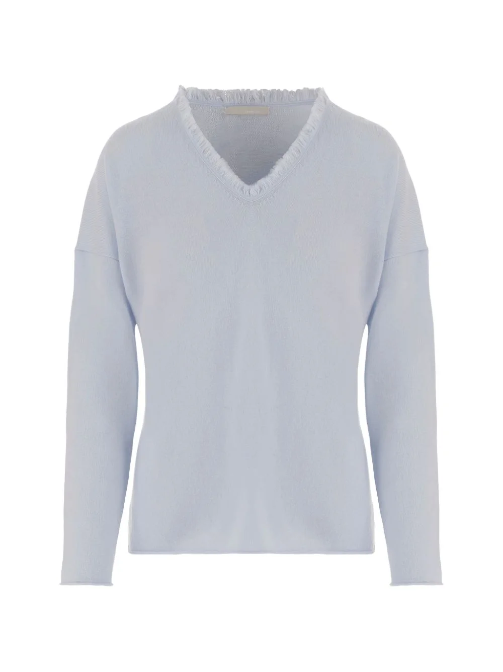 fringed-neck sweater Highlights - Light blue - V-neck - Fringed trim - Long sleeves - Straight hem Imported Composition Virgin Wool 70%, Cashmere 30% Washing instructions Read Manufacturer Guidelines