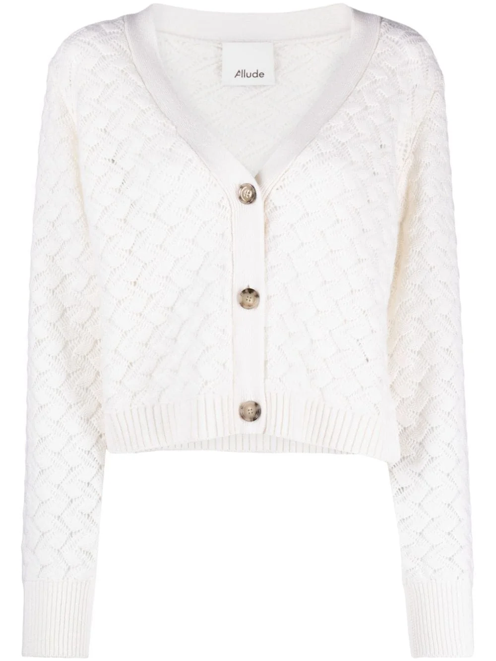 V-neck crochet-knitted cardigan Highlights - Beige - Virgin wool-cashmere blend - Knitted construction - Crochet knit - V-neck - Front button fastening - Long sleeves - Ribbed cuffs and hem - Straight hem Imported Composition Virgin Wool 70%, Cashmere 30% SIZE & FIT Model measurements Height 5 ft 10 in(1.77 m) Bust/Chest 29.92 in(76 cm) Hips 34.25 in(87 cm) Waist 23.62 in(60 cm) FittingInformation Designed for a relaxed fit, this piece allows for comfort and movement when worn Made with a midweight knit, this piece offers some stretch This piece fits true to size – take your usual size Washing instructions Hand Wash