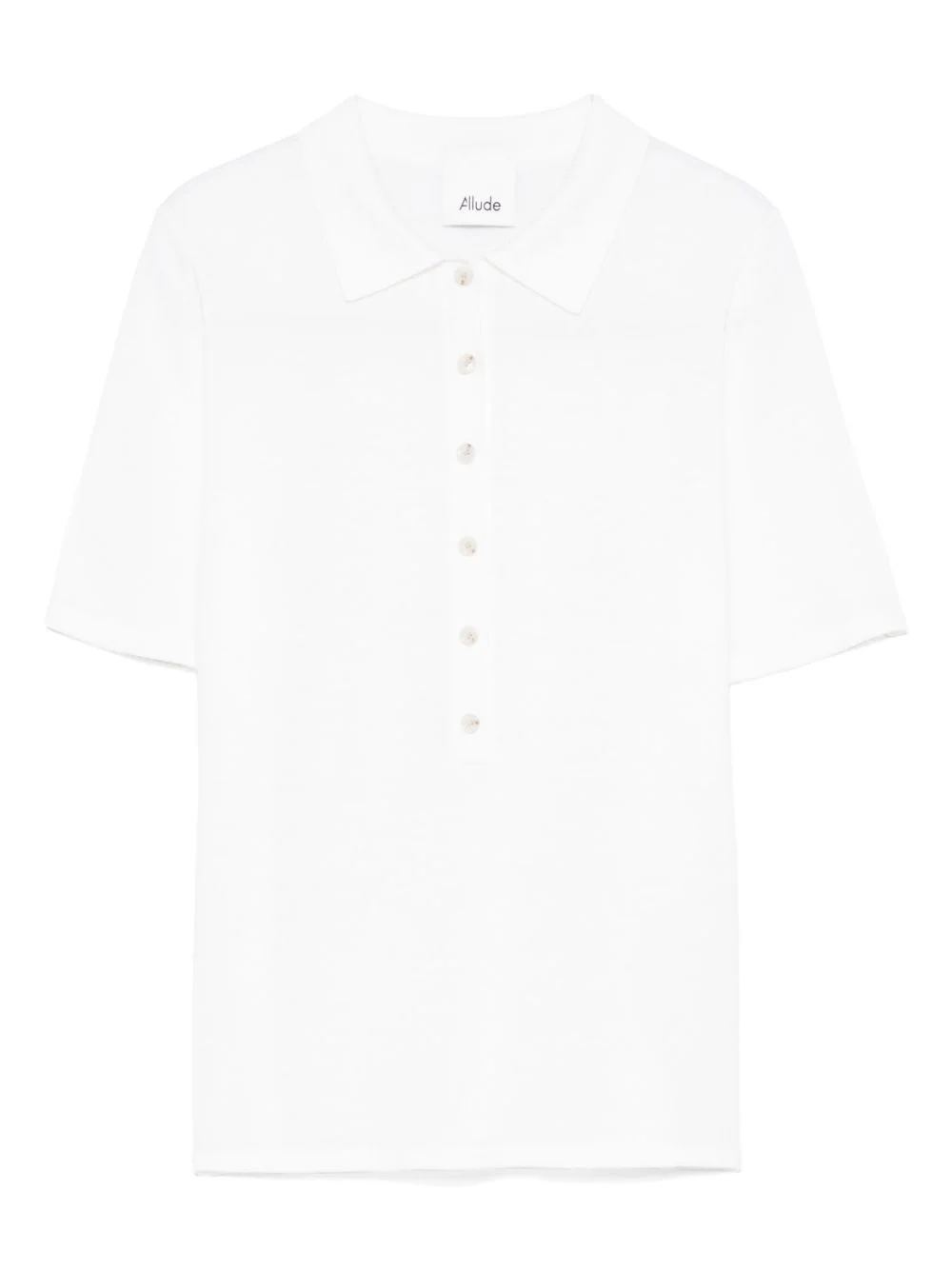 virgin wool top Highlights - White - Front button placket - Polo collar - Short sleeves Imported Composition Virgin Wool 100% SIZE & FIT Model measurements Height 5 ft 10 in(1.77 m) Bust/Chest 33.07 in(84 cm) Hips 37 in(94 cm) Waist 24.8 in(63 cm) FittingInformation Designed for a slim fit that sits just away from the body offering a close yet comfortable fit Made with a lightweight knit, this piece offers some stretch