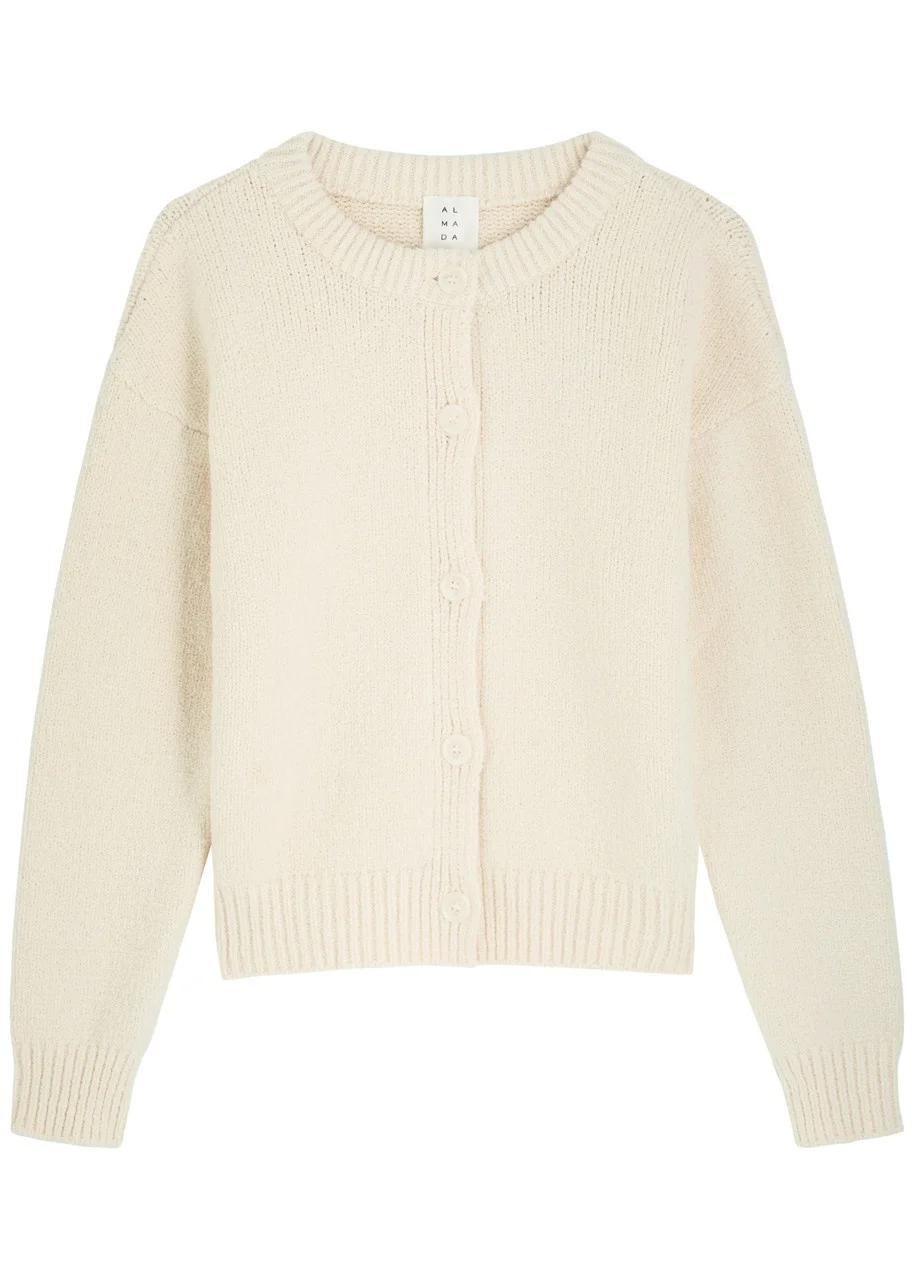 Info & Care Almada Label knitted boucle;cardigan Round-neck, dropped shoulders, ribbed trims Button fastenings through front 82%;cotton, 16% polyamide, 2% elastane Hand wash Size & Fit Length shoulder to hem: 20.5 inches/ 52cm Midweight Relaxed fit Model is 5'10"/ 178cm and wears a size small