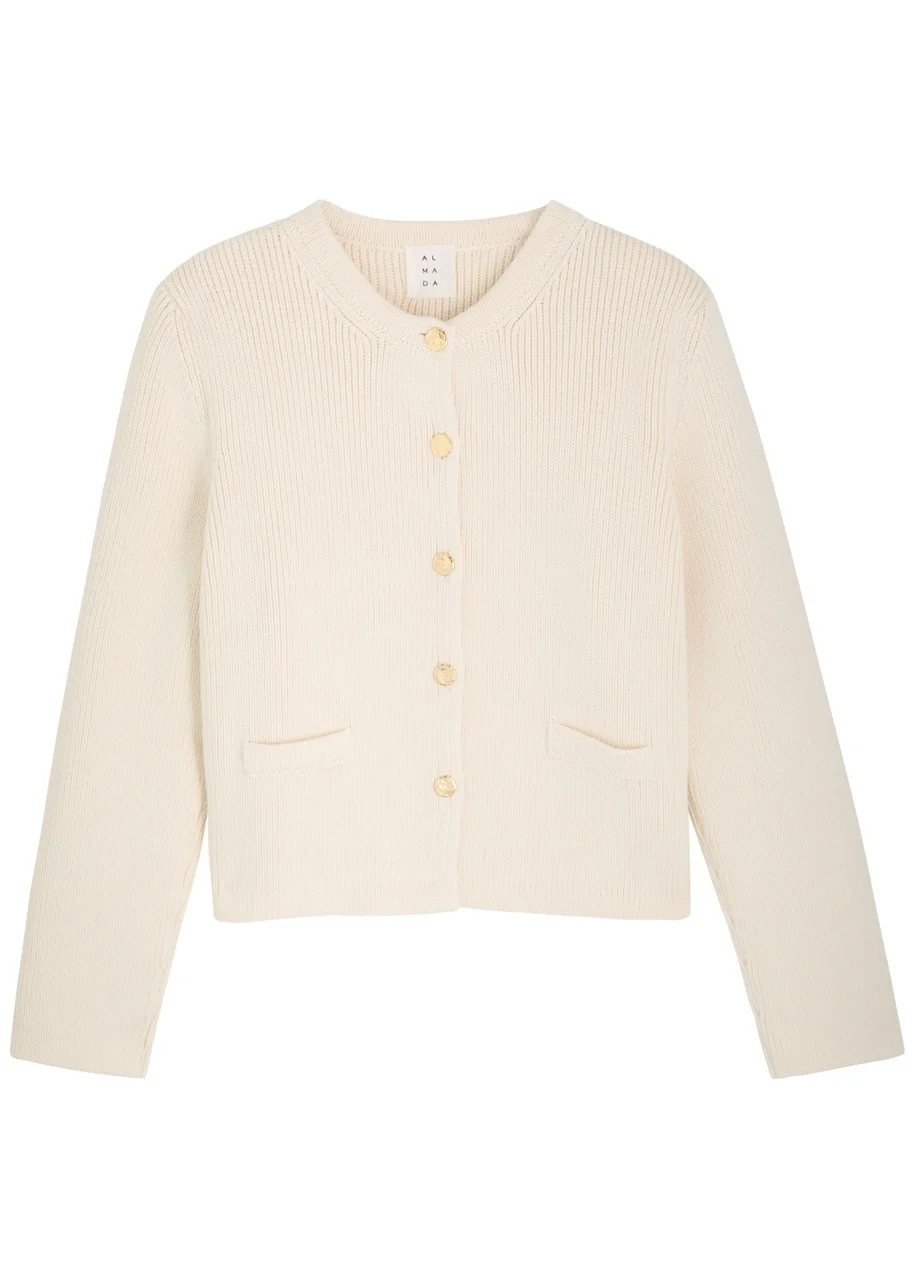Info & Care Almada Label cotton-knit cardigan; Ribbed, round-neck, padded shoulders, faux pockets at front; Button fastenings through front 100% organic cotton Hand wash Size & Fit Length shoulder to hem: 20 inches/ 50.5cm Midweight Regular fit Model is 5'10"/ 178cm and wears a size small;