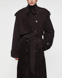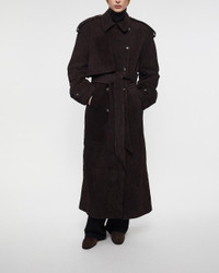 Sienna Suede Coat by Almada Label. A luxurious coat in soft suede with a double-breasted trench silhouette and long midi length. The model features padded shoulders for a more refined shape and comes with a detachable suede belt, storm flap, and buttons extending to the collar, allowing it to be worn up or down. Designed with a slightly oversized, relaxed fit. Size and Fit - Fits true to size, choose your usual size Specification - Article number - ID: 176901-950 - Brand: Almada Label - Color: Chocolate - Washing Instructions: Professional cleaning by leather specialist - Made of: 100% Lamb leather