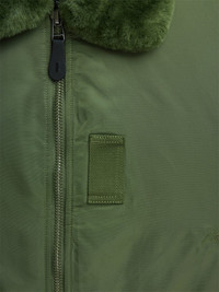 PRODUCT DETAILS The B-15 is a classic bomber jacket made tough to battle the harsh elements. Features a nylon shell and removable synthetic mouton fur collar. The Alpha B-15 features button tabs once used by pilots to connect oxygen masks and headset wires. Comes in Black, Sage and Navy (please note that the original color 'Navy' ordered by the U.S. Military has more of a teal shade to it, rather than the darker 'navy blue' traditional jackets are known for). This bomber jacket tends to be more generous in the torso so if you like a tight fit order down a size or consider our B-15 Slim Fit. Male Model Information: - Height 6'2" - Size: Large DETAILS - Alpha's heritage flight nylon B-15 silhouette with a removable faux-mouton collar. BENEFITS - Water Resistant FEATURES - Removable faux-mouton collar - Alpha logo on zig-zag zipper extension - MA-1 utility pocket on sleeve - Signature red ribbon on utility pocket - Sleeve shirring - Oxygen tab on chest - Two lower welt pockets - Two interior welt pockets - Knit rib cuffs and waistband - Ottoman knit cuffs - This garment is a unisex style. This jacket fits true to size for a men’s core fit. Women are recommended to choose 1 size down. PRODUCT HISTORY The B-15 is a classic flight jacket made tough to help service members and pilots battle the harsh elements.