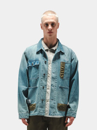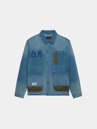 This relaxed fit, lightweight denim chore coat features nylon piecing along the front pockets for added interest. Other features include a subtle embroidered ALPHA logo on the front chest and fold down collar. FEATURES - Unisex style - Four patch pockets on front with three having nylon piecing on front - Alpha script logo embroidery at chest - Fold down collar