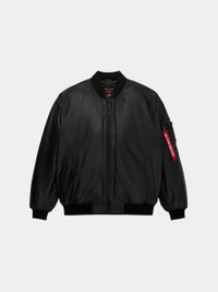 Crafted from genuine Napa leather, the Leather MA-1 Flight Jacket reimagines a classic aviator silhouette with a bold, oversized fit. Inspired by the original MA-1 design, it features a center front zipper with distinctive zig-zag stitching, two welt pockets, an interior welt pocket, and a functional sleeve utility pocket complete with signature red ribbon detail. Poly-fill insulation adds warmth without bulk, making it perfect for transitional weather. The supple leather exterior offers both durability and a premium feel, ensuring this jacket becomes a long-lasting staple for any modern wardrobe. FEATURES - Inspired by MA-1 Flight Jacket - Genuine Napa Leather - Center front zipper with zig zag stitch on front placket - Two welt pockets, 1 interior welt - Utility pocket on sleeve with Alpha ribbon MODEL INFO - Height: 6' 1" - Size: Large