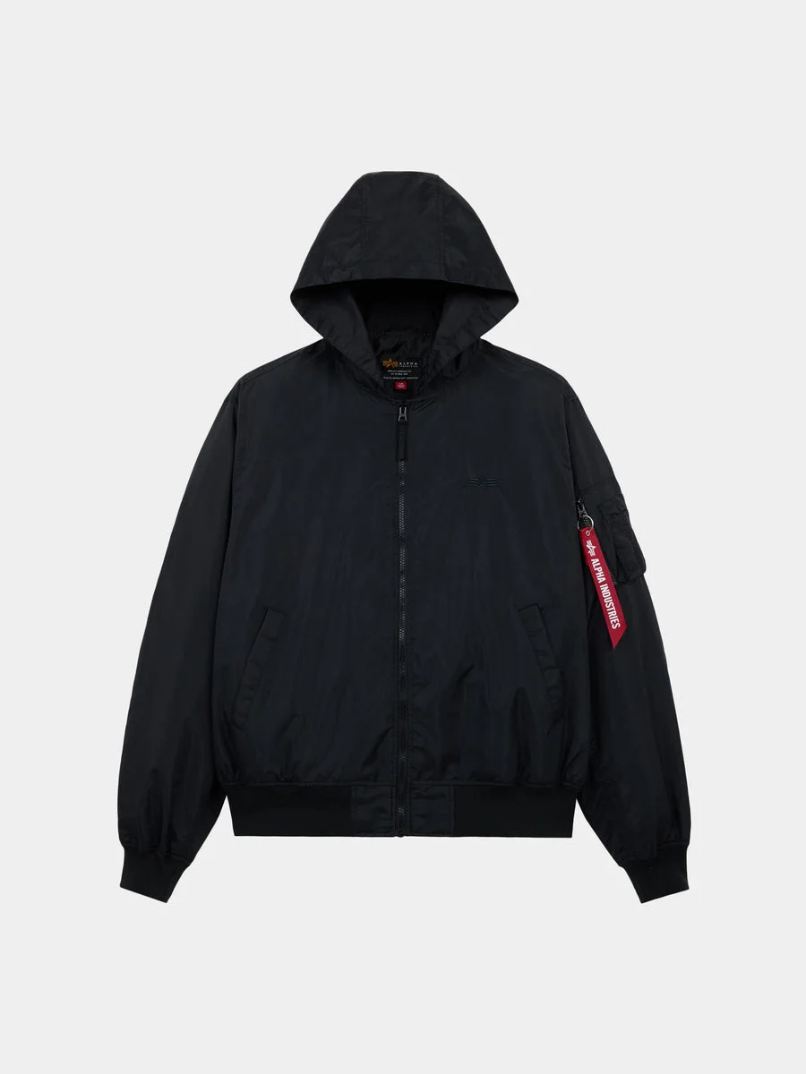 The Logo L-2B Hooded Hunter is a lightweight, relaxed fit flight jacket. It features an embroidered Alpha "Flying A" logo on the chest. Featuring a water-resistant nylon shell and an added hood, the L-2B Hunter is perfect for any Spring weather. BENEFITS - Water Resistant FEATURES - Unisex style - Hooded - Center front zipper closure - Two welt pockets on front - Utility pocket on sleeve with alpha red ribbon - Rib knit cuff, collar, and hem - Small alpha logo embroidery on chest MODEL INFO - Height: 6' 2" - Size: Large
