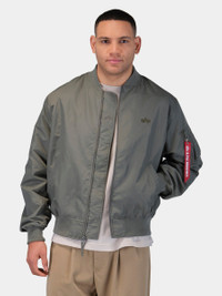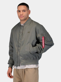 The Logo L-2B Hunter Relaxed Flight Jacket is a lightweight, relaxed fit flight jacket perfect for warmer weather. Crafted from lightweight, water-resistant nylon, the L-2B Hunter is a Spring closet staple. This jacket features an embroidered Alpha "Flying A" logo on the front chest. BENEFITS - Water Resistant FEATURES - Unisex style - Center front zipper closure - Two welt pockets on front - Utility pocket on sleeve with alpha red ribbon - Rib knit cuff, collar, and hem - Small alpha logo embroidery on chest MODEL INFO - Height: 6' 2" - Size: Large