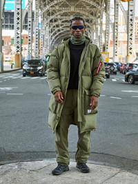 Brave icy storms with this sturdy parka, complete with lightweight but warm down insulation. This unique puffer features multiple pockets and interior backpack straps to make it easier to be on the go. FEATURES - Horizontal quilting - Center front zipper with placket overlay; velcro closure - One upper zipper pocket - Two zipper pockets at chest - Two lower patch pockets with flap - Adjustable velcro cuff - Inner zippered pocket - MA-1 utility pocket with alpha red ribbon on sleeve - Interior backpack straps - Fully lined - Water resistant - Down fill is RDS (Responsible Down Standard)