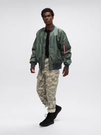 This versatile, reversible MA-1 bomber is now available in our signature garment-wash. With all the traditional functions of the MA-1 and a warm polyester fill, this jacket was specially designed to prepare you for chilly temperatures. DETAILS - Alpha’s classic MA-1 bomber with a heavy garment wash. BENEFITS - Battlewash - Reversible FEATURES - Alpha logo on zipper extension - MA-1 utility pocket on sleeve with pen cap inserts - Signature red "Remove Before Flight" flag - Sleeve shirring - Two exterior flap pockets - Two interior welt pockets - Knit collar, cuffs and waistband - Ottoman knit cuffs Battlewash is our unique garment dye and distressing process that breaks down the colors of the fabric for a worn-in, vintage look. When garment dying, there are variables that will come style by style, and therefore no two will come out the same. MODEL INFORMATION - Height: 6'1" - Size: Large