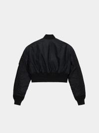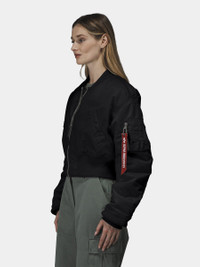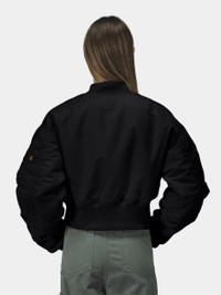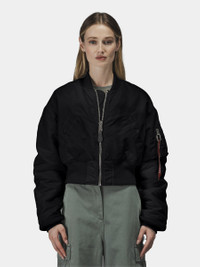 A modern update to an iconic silhouette, the Cropped MA-1 Flight Jacket offers bold style with classic functionality. Made from durable, water-resistant flight nylon, this jacket is reversible and fully lined, allowing versatile wear. The cropped cut adds a contemporary edge, while details like the knit collar, cuffs, and waistband preserve its heritage roots. Featuring two exterior flap pockets and the signature MA-1 utility pocket with red ribbon, it balances fashion with function. Designed in a regular fit, this jacket brings statement style to everyday wear. BENEFITS - Water resistant FEATURES - Cropped - Fully lined - Knit collar, cuffs, and waistband - Two exterior flap pockets and MA-1 utility pocket with Alpha red ribbon on sleeve MODEL INFO - Height: 5' 8" - Size: Small