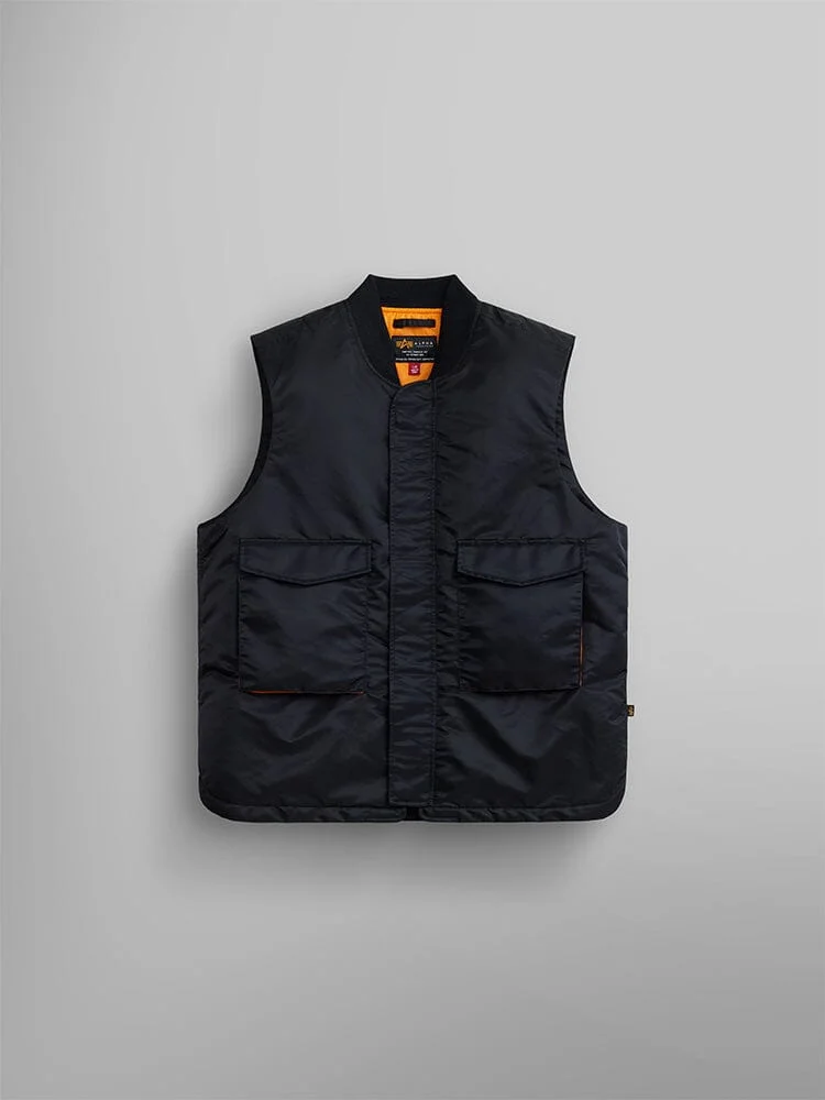 Made of our classic flight nylon, this black MA-1 inspired vest is the perfect outer layer for those mild temperatures. FEATURES - Water resistant - Zig zag stitch placket - Onion quilted lining - Knit collar - Two front patch pockets with flap and hidden snap MODEL INFO - Height: 6'2.5 - Size: Large