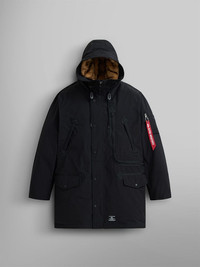 Brave the winter storms with this N-3B parka, newly updated with comfy down fill. It features removable faux fur and a unique zippered map pocket at the chest. FEATURES - Center front zipper closure with snap placket - Removable faux fur around hood - Map pocket with zipper at chest - Two welt pockets with webbing detail at chest - Two lower welt pockets with flap, snap closure, and webbing detail - Adjustable drawstring with faux leather stopper at waist and hood - Knit rib storm cuff - MA-1 utility pocket with Alpha red ribbon on sleeve - Fully lined - Updates from GEN I; removed all prints, improved hood fur, snap front closure - Water resistant