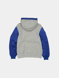 Support your team in style with the New York Giants x Alpha x New Era MA-1 Zip Up Hoodie. This French terry hoodie incorporates elements of the iconic MA-1 bomber jacket with nylon sleeves and signature utility pocket and Alpha Industries red ribbon. This zip up hoodie features a Giants patch and embroidery throughout. BENEFITS - Cozy and breathable fleece - Great for layering and transitional weather FEATURES - Nylon applique - Embroidered patch - Embroidery + woven label