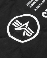 DETAILS A button up liner jacket with Alpha print on back. FEATURES - Center front button closure - Two front pockets - Silicone badge with woven label - Alpha print on back - Rib knit cuff