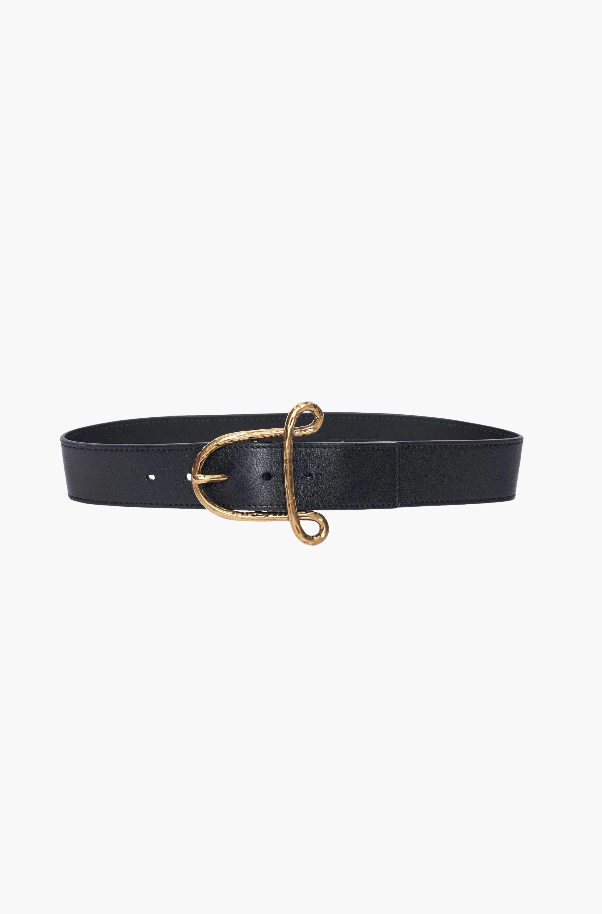 The A Belt is crafted in smooth black leather with tonal topstitching. Features an abstract A-shaped buckle in textured gold-tone metal at the center-front. Details Gold-tone metal hardware Pin buckle closure 100% Calf leather Total length: 32 inches / 81cm Width: 1.5 inches / 4cm