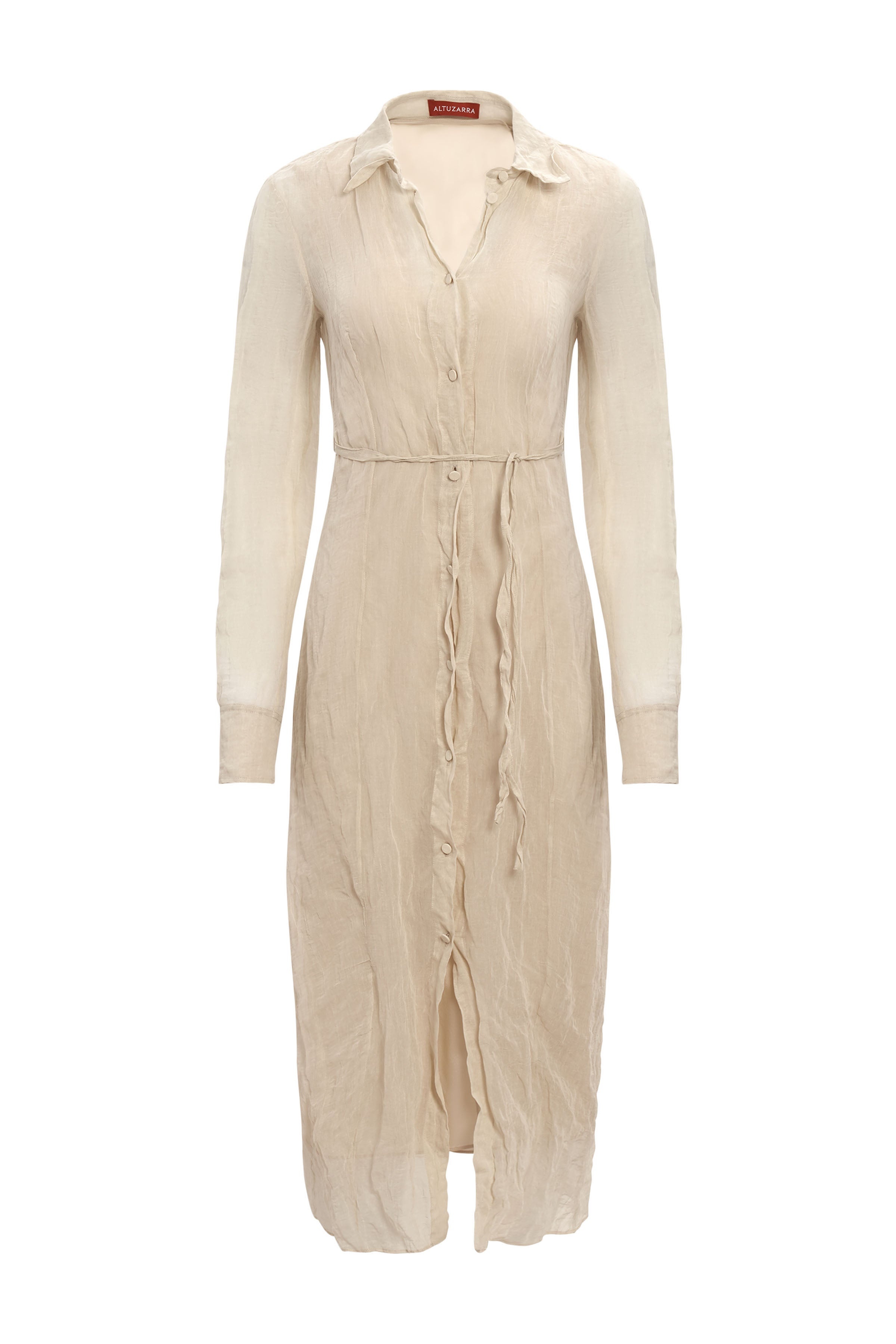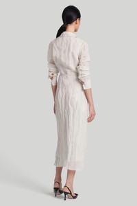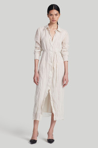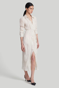 The ‘Agnes’ dress formed part of the Altuzarra’s SS24 runway collection where familiar and enduring signature silhouettes were transformed by crinkled fabrics. It’s fitted with a point collar, waist tie and button front fastenings. Details - Midi length - Front slit - Button fastening - Waist tie - Point collar - 59% Cotton, 31% Metallic Fibre, 10% Silk - Made in Italy - Model is 5'10" and is wearing a size 36